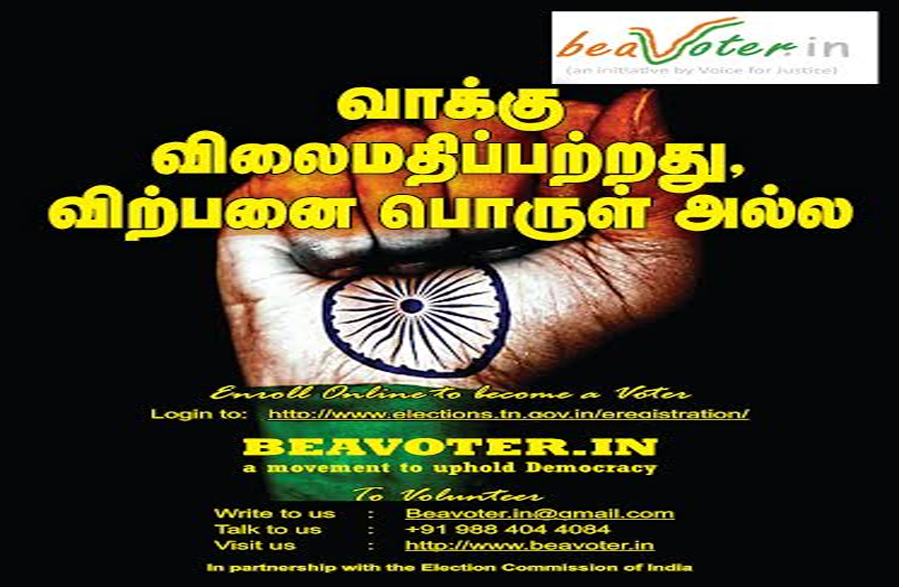 Be A Voter is a movement initiated by the Voice for Justice. The movement has its objective to strengthen the democratic system in India by encouraging and promoting maximum participation of citizens in the electoral process. We are working to deliver the message : "Voting is not just a right; it is a responsibility". The movement is patronised by several eminent personalities and has the former Chief Election Commissioner of India Mr.T.S.Krishnamurthy as its Patron in Chief.